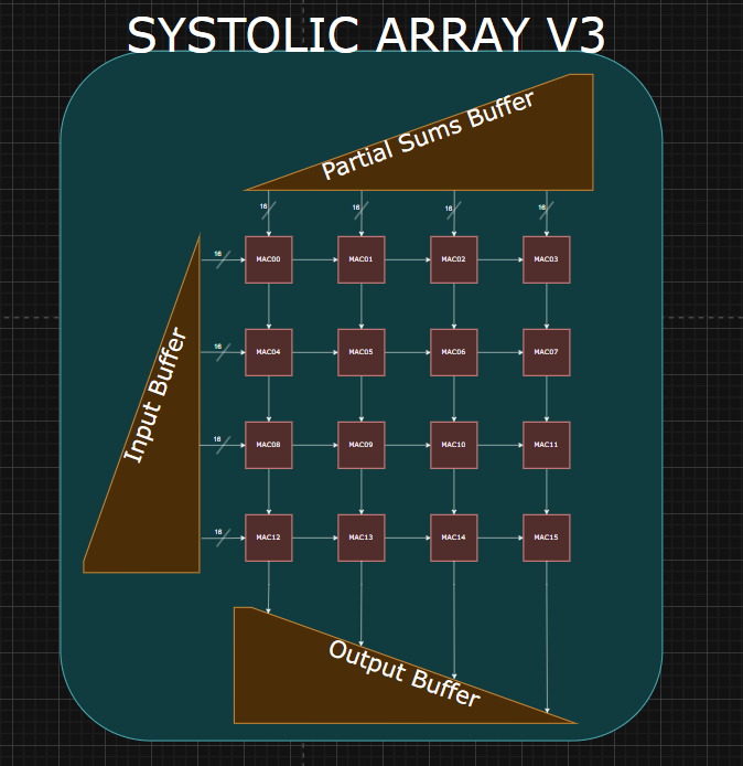 Important Architecture Decisions: This architecture is based on this Google TPU Patent. The design uses a weight stationary approach where weights are loaded in columns-wise and held in the multiplier. The activation matrix is stored into an input buffer, and inputs to the multipliers are staggered in groups of 4. The outputs of the TPU are staggered so an output buffer is used to organize the result into rows.